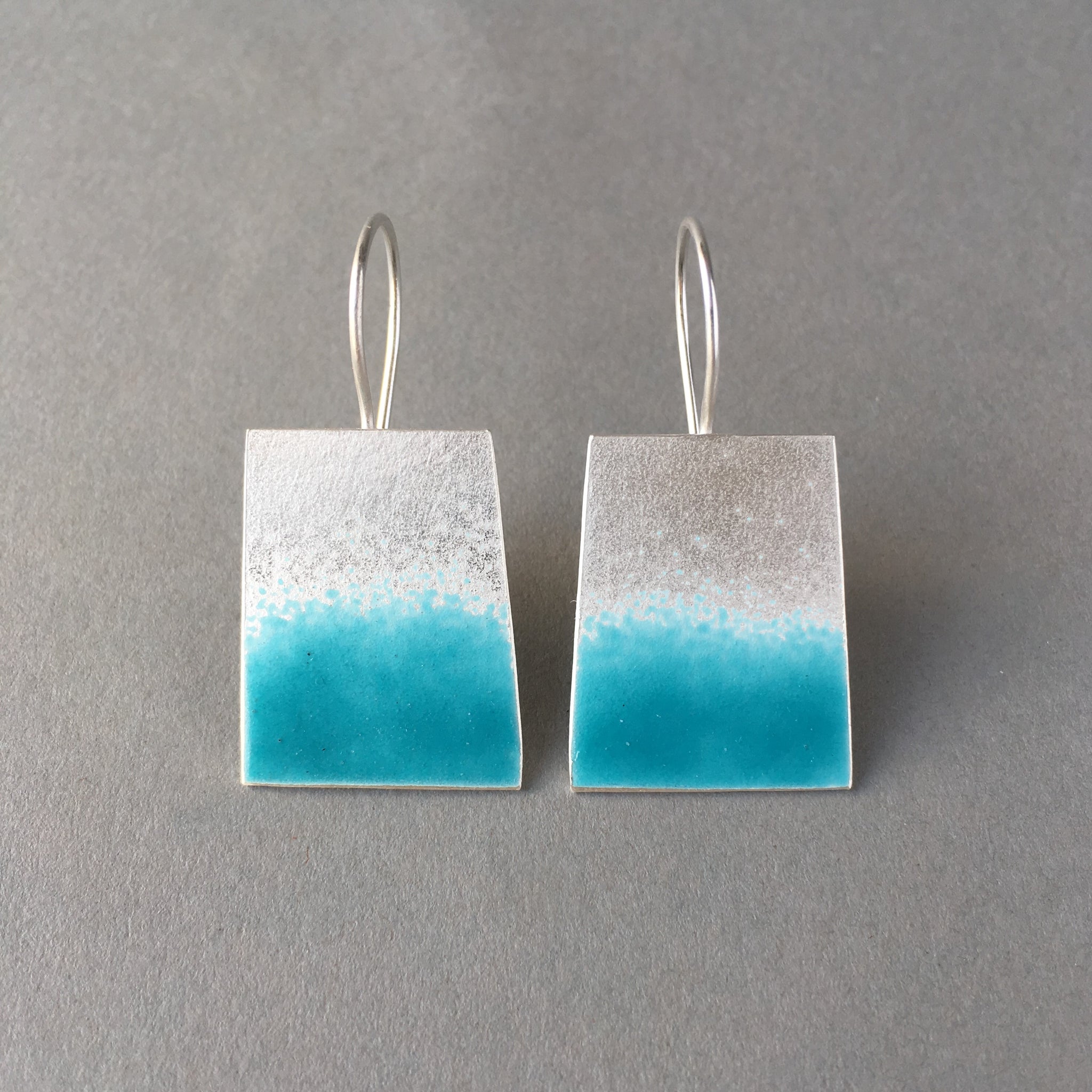 Trapezium shaped hook earrings in silver with enamel in deep turquoise.