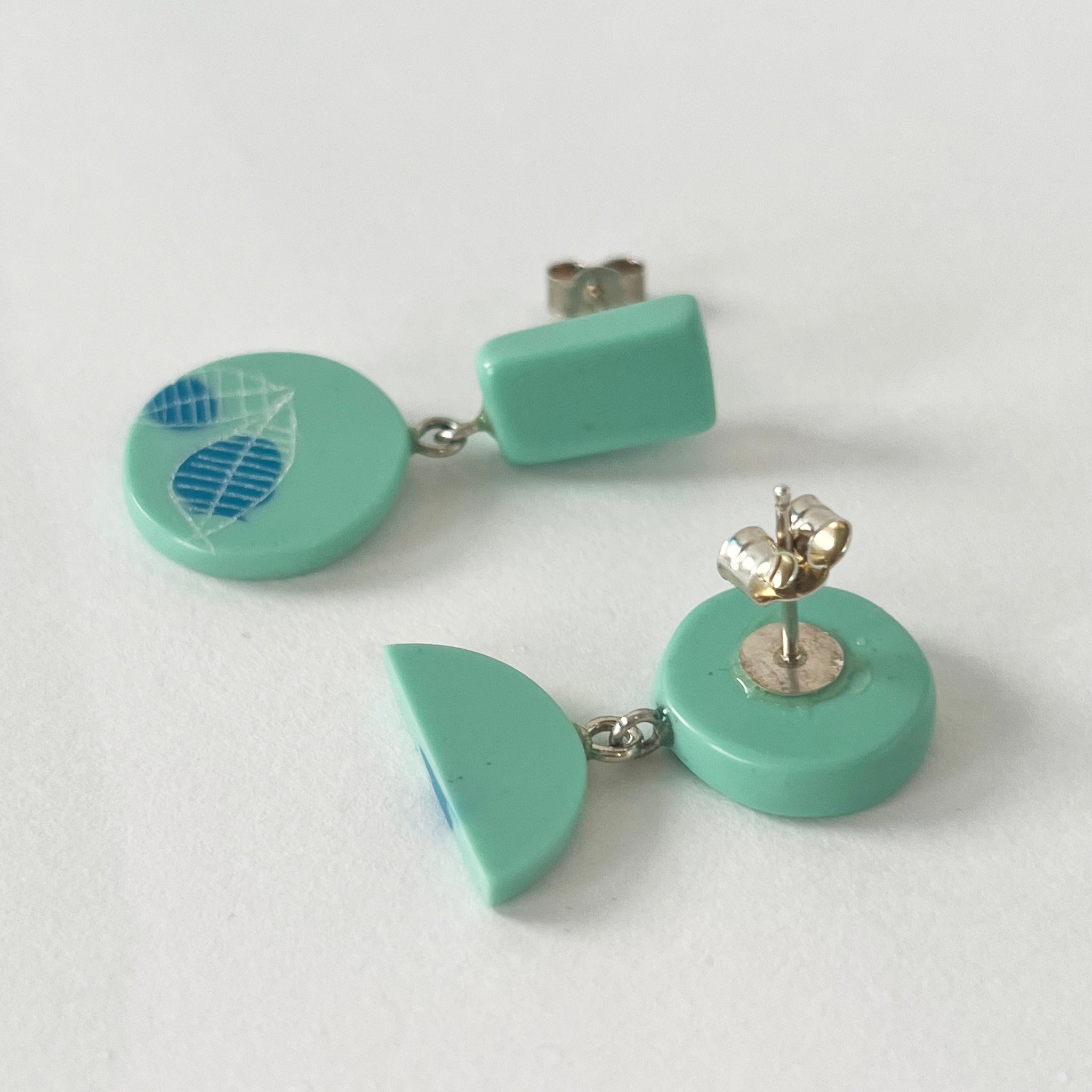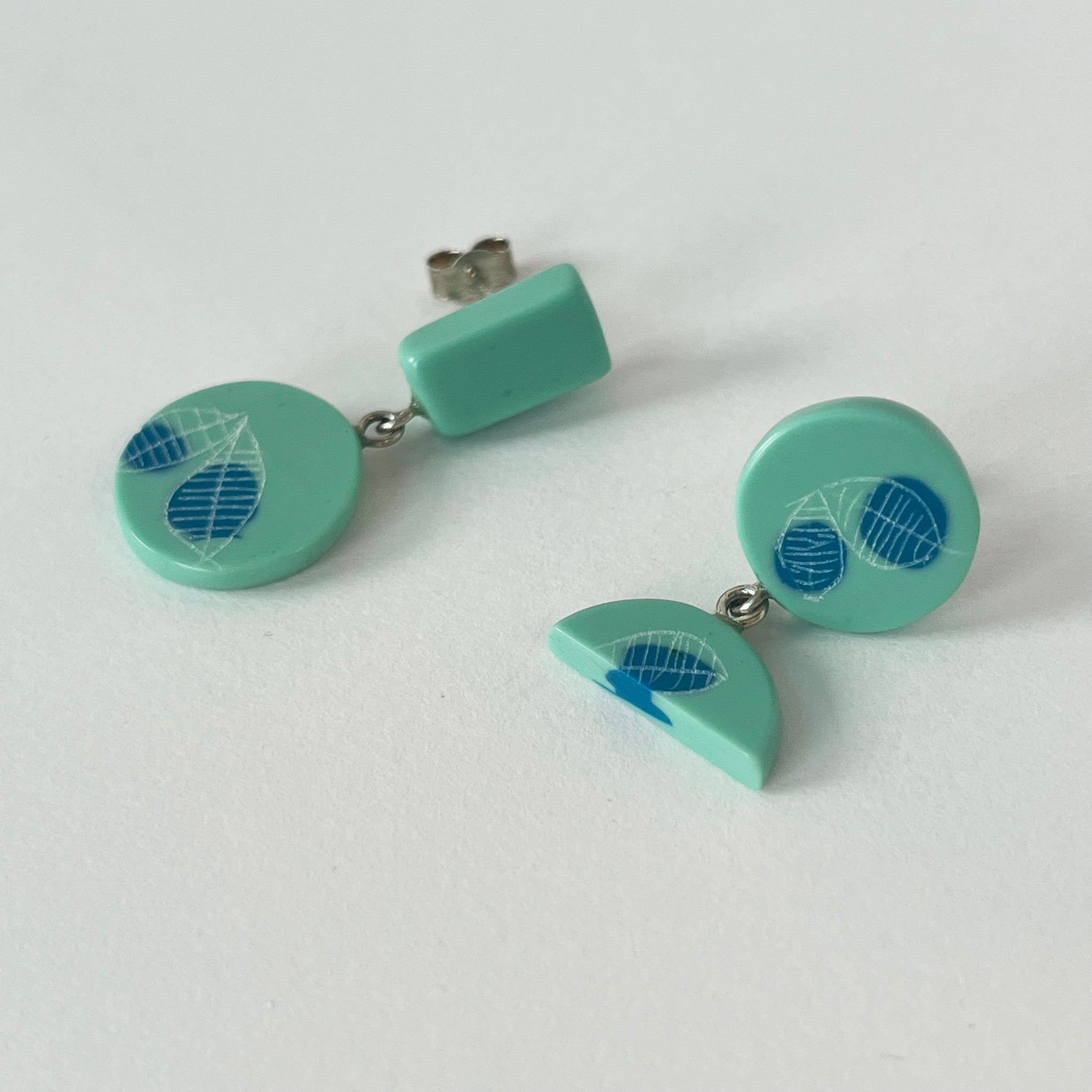 Aqua and blue resin double drop earrings with sgrafitto details. Recycled silver ear hooks and silicone stoppers.