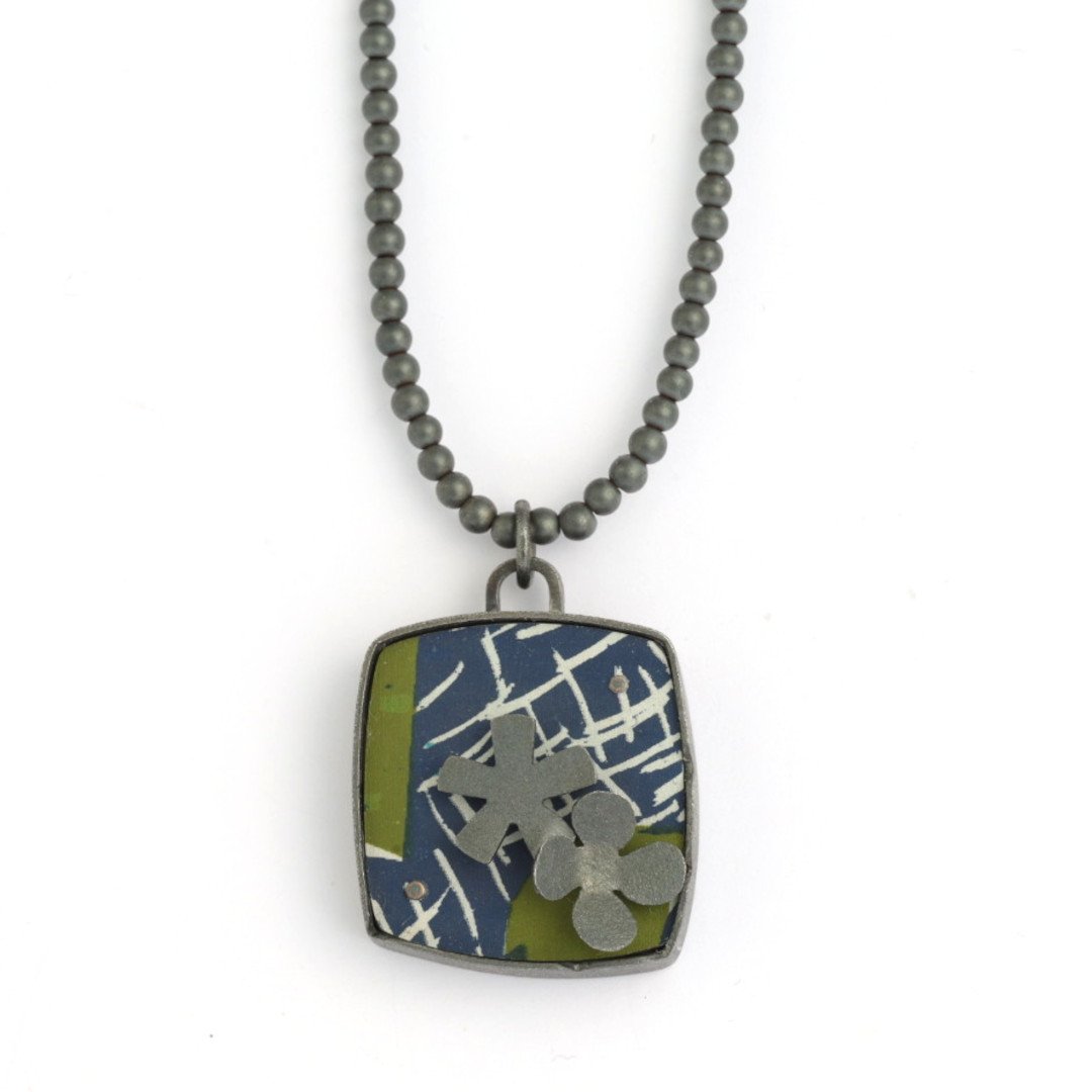 This little framed pendant combines screen-printed anodised aluminium with the dark tones of oxidised silver and a small posy of flowers. The flowers are assembled on pivoting stalks so that they turn to create an alternative arrangement. Each piece is one of a kind, made from screen printed anodised aluminium and oxidised silver, the necklace is strung with hematite and rough emerald beads.