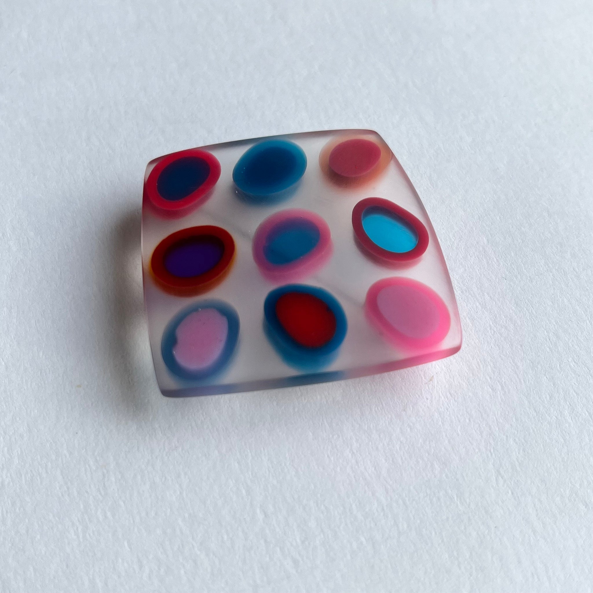 Rectangle shape cast hand coloured and matt finished resin brooch in pinks and blues. Hand made brooch fitting in silver with a sprung stainless steel pin.