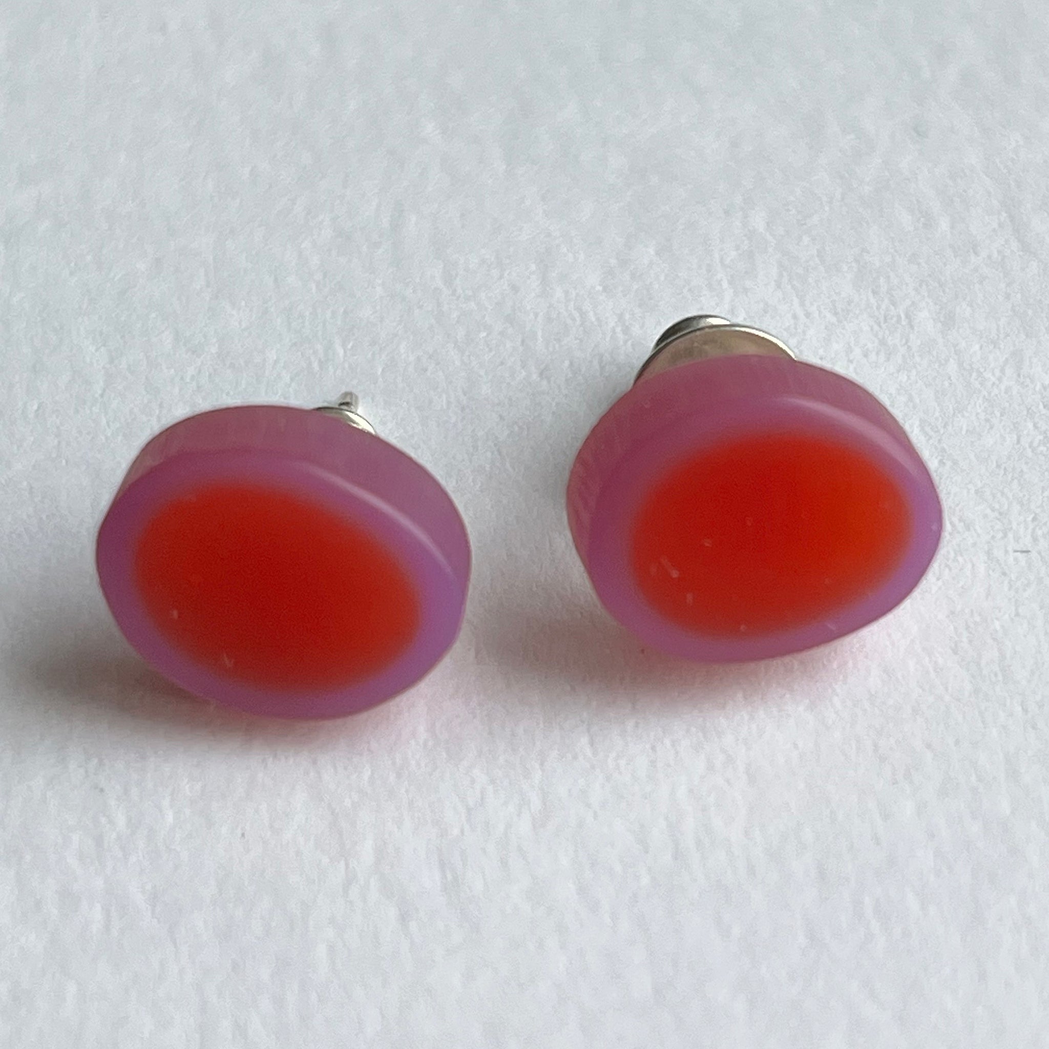 Cast hand coloured and matt finished tiny oval shaped resin stud earrings in red and pale purple with silver plate post and bell back retainer.