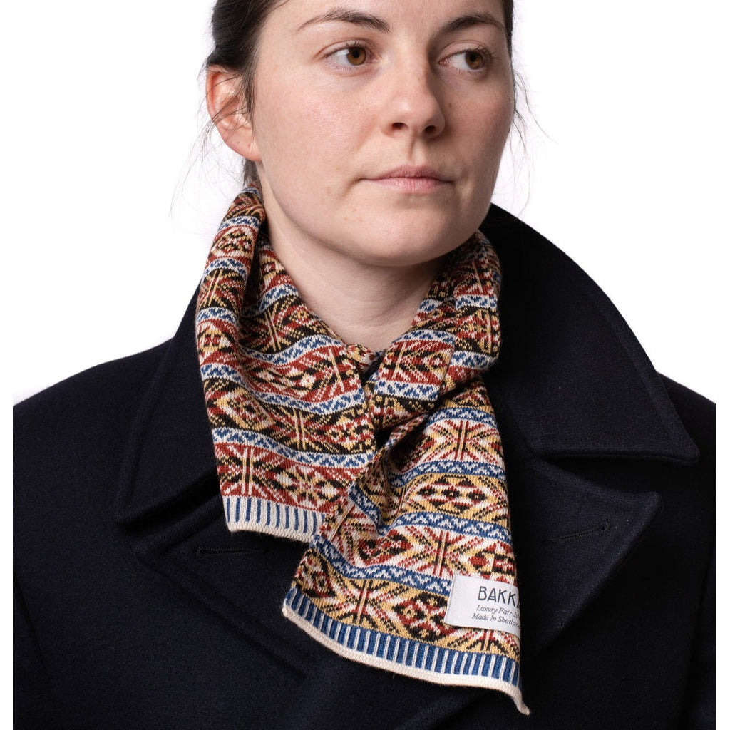BAKKA produces Fair Isle textiles to the highest quality and standards. It preserves Shetland's rich knitwear heritage by using the oldest Fair Isle patterns and colours in a contemporary manner. All pieces are knitted in a unique reversible Fair Isle fabric using 100% superfine merino, a luxurious silky soft, warm and affordable yarn which is both sustainable and traceable. BAKKA operates a zero-waste policy. All samples and waste pieces are upcycled.