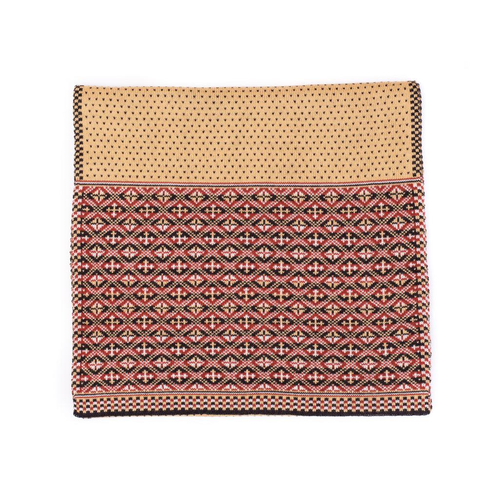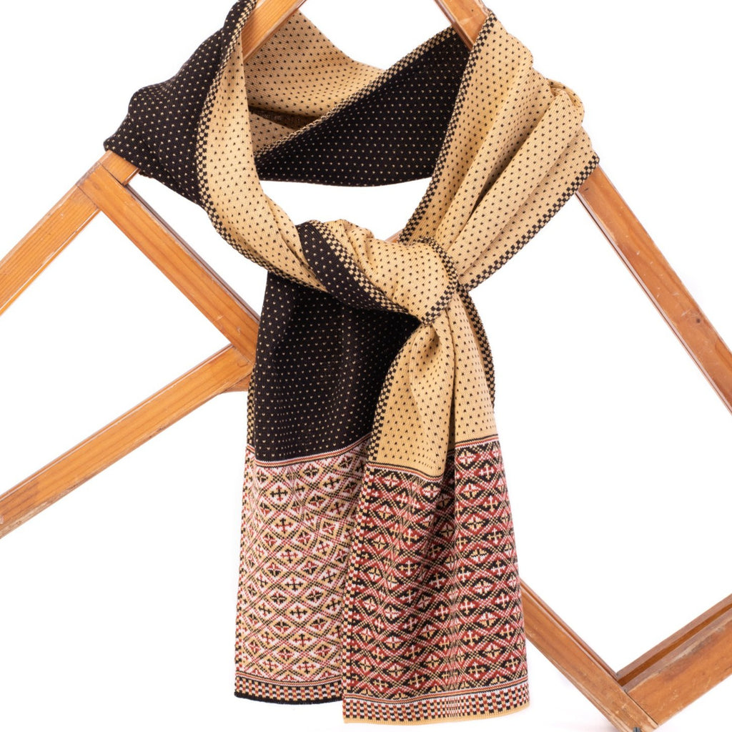This four colour reversible scarf has an old, simple Fair Isle pattern at the ends and a polka dot pattern in the middle in Shetland black and flax.