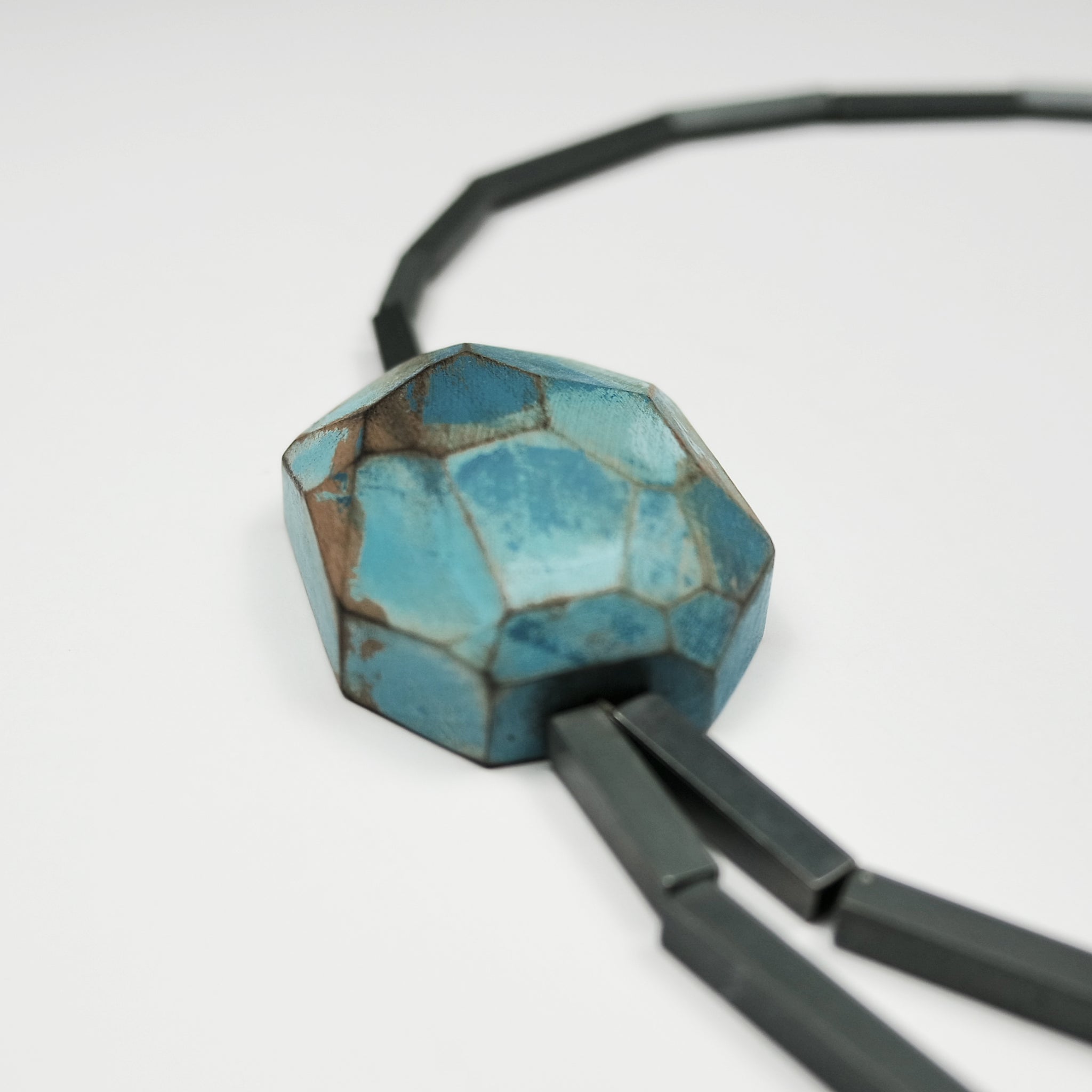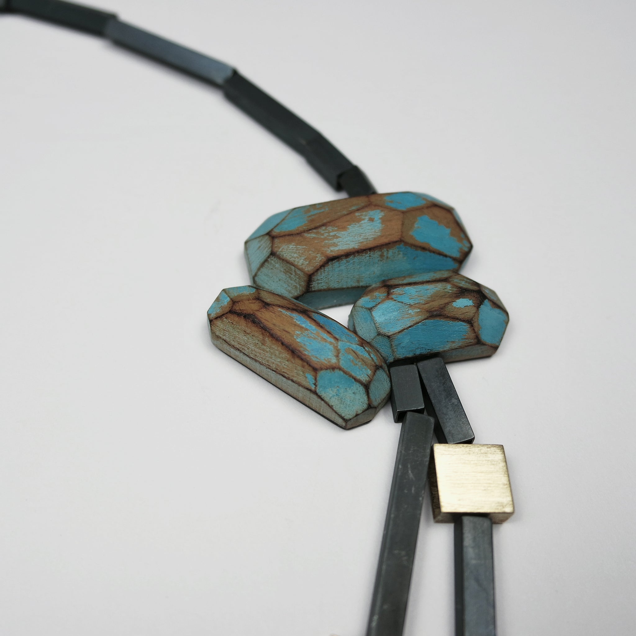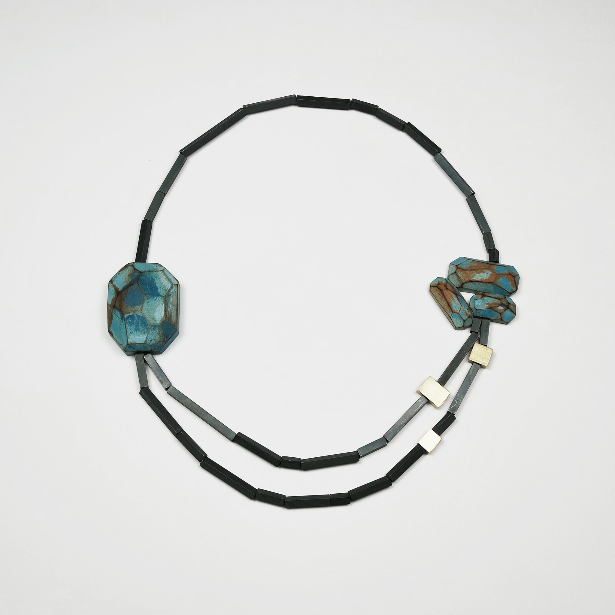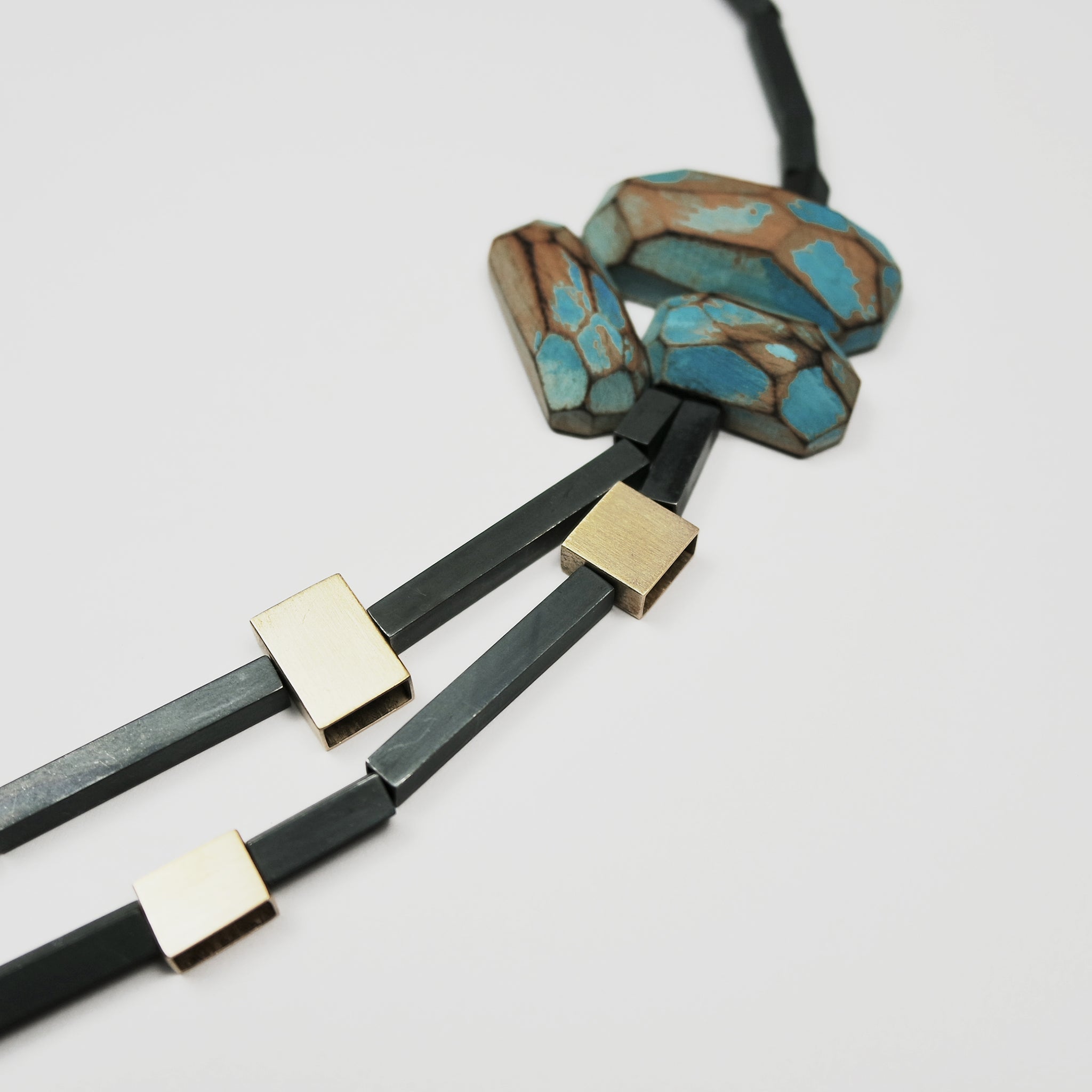 Statement necklace featuring carved wooden 'stones' in turquoise, with oxidised silver, and 18ct gold tubes.