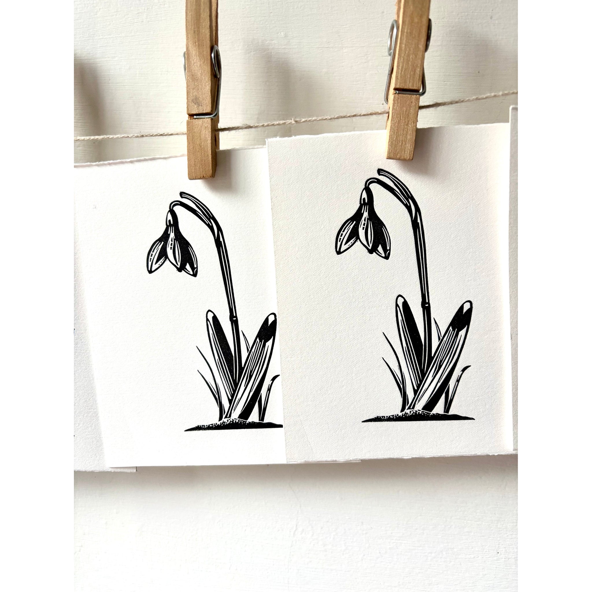 A handcarved linoprint depicting a snowdrop flower to celebrate the Celtic festival of Imbolc. Printed in rich black oil based ink on heavyweight Fabriano Rosaspina paper on Cally's Hawthorn press.