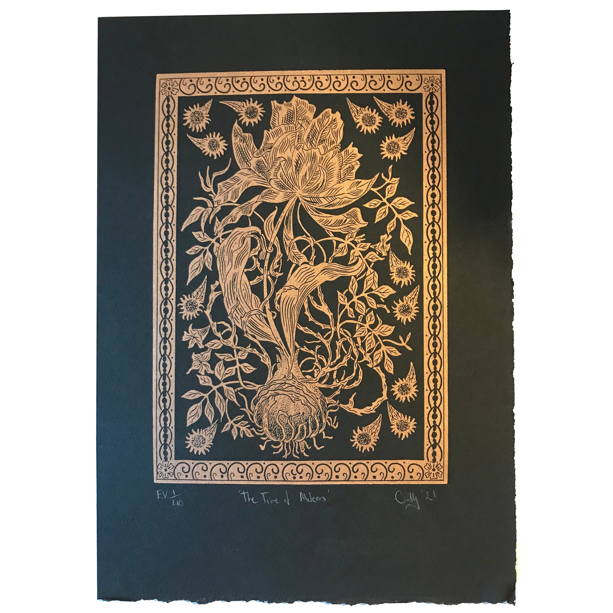 ”This print has been inspired by medieval illustrations found in 'herbals' which were books depicting plants and their uses, and medieval illuminated manuscripts. The subject matter is drawn directly from tulips that I grew myself for the first time this year. I began researching into 'Tulip Mania' in the Dutch Golden Age, where tulip bulbs could be bought for the price of a house. The meteors flying around tell something of this extraordinary time, as meteors and comets were viewed as auspicious, and the bringer of strange events.”