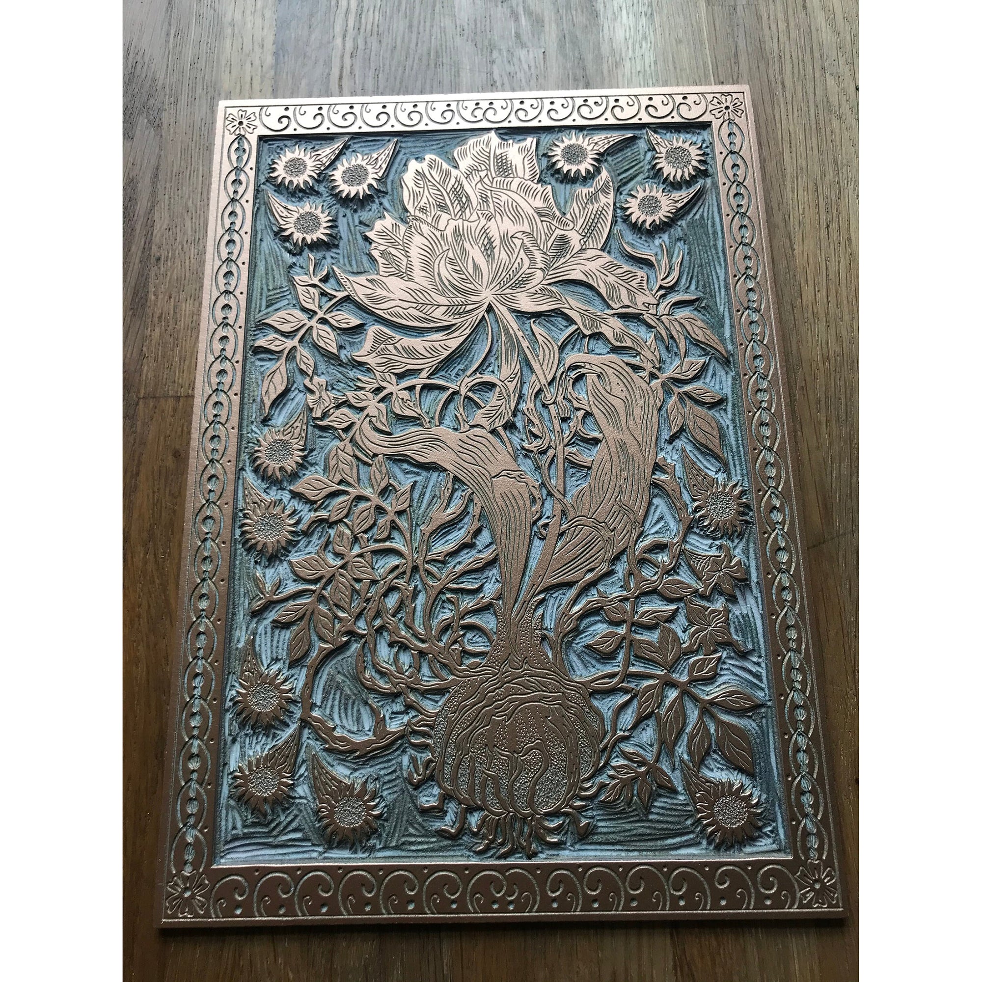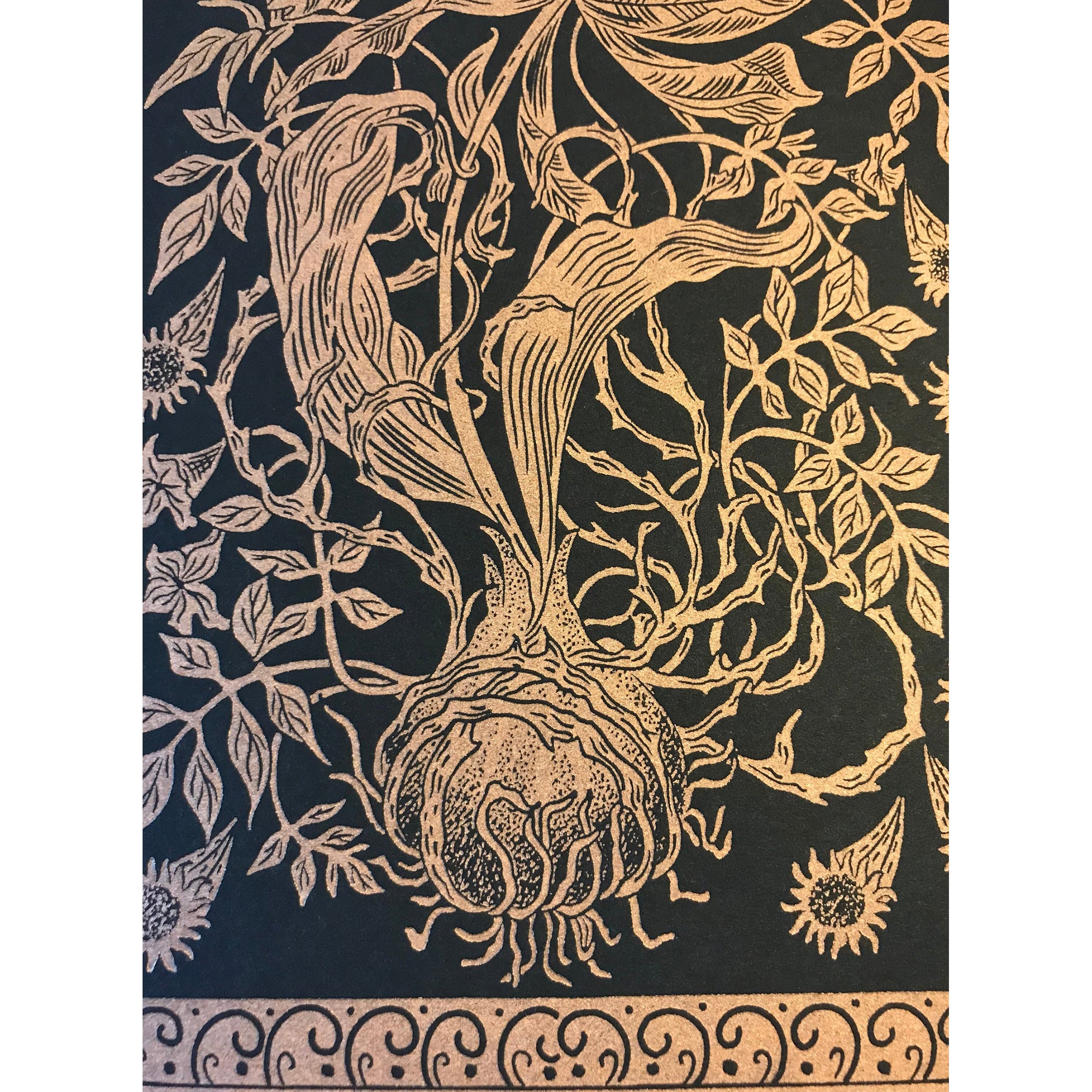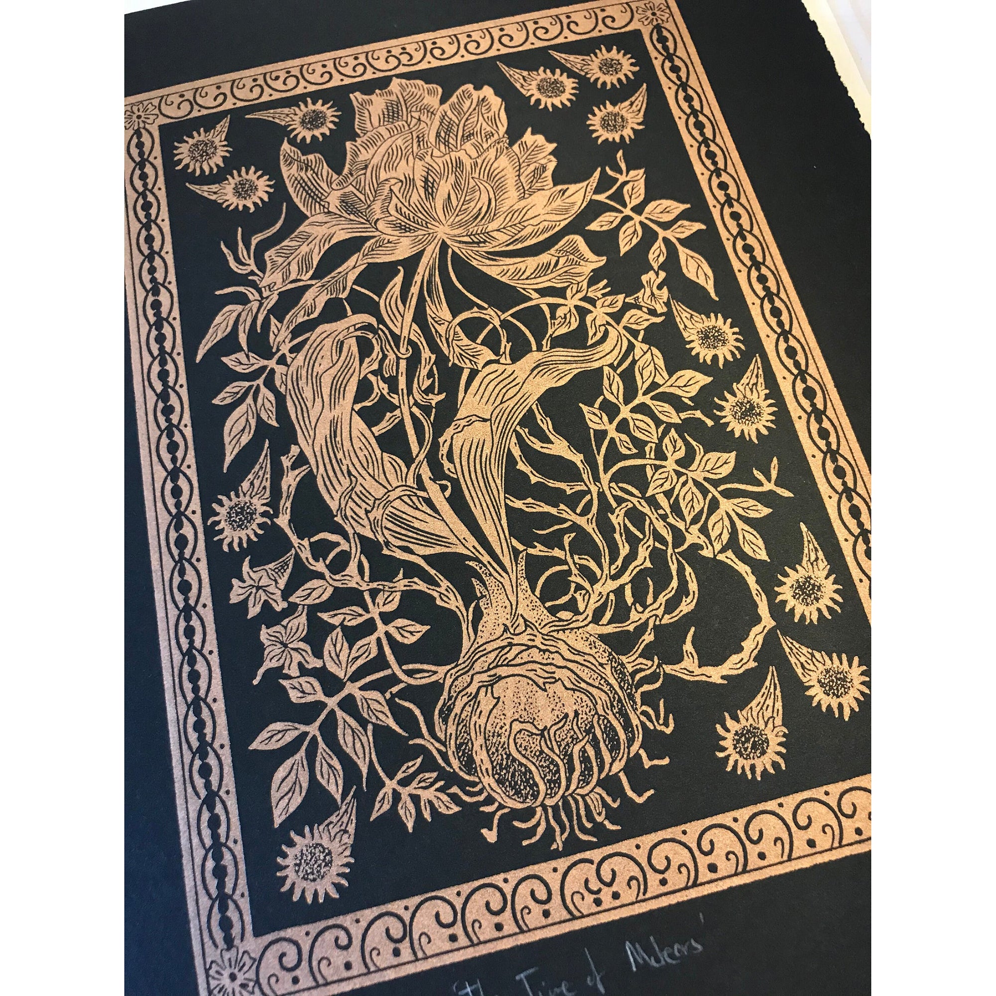 The Time of Meteors is a one colour linocut print printed on black Somerset Velevet 300gsm paper in oil based metallic copper ink.