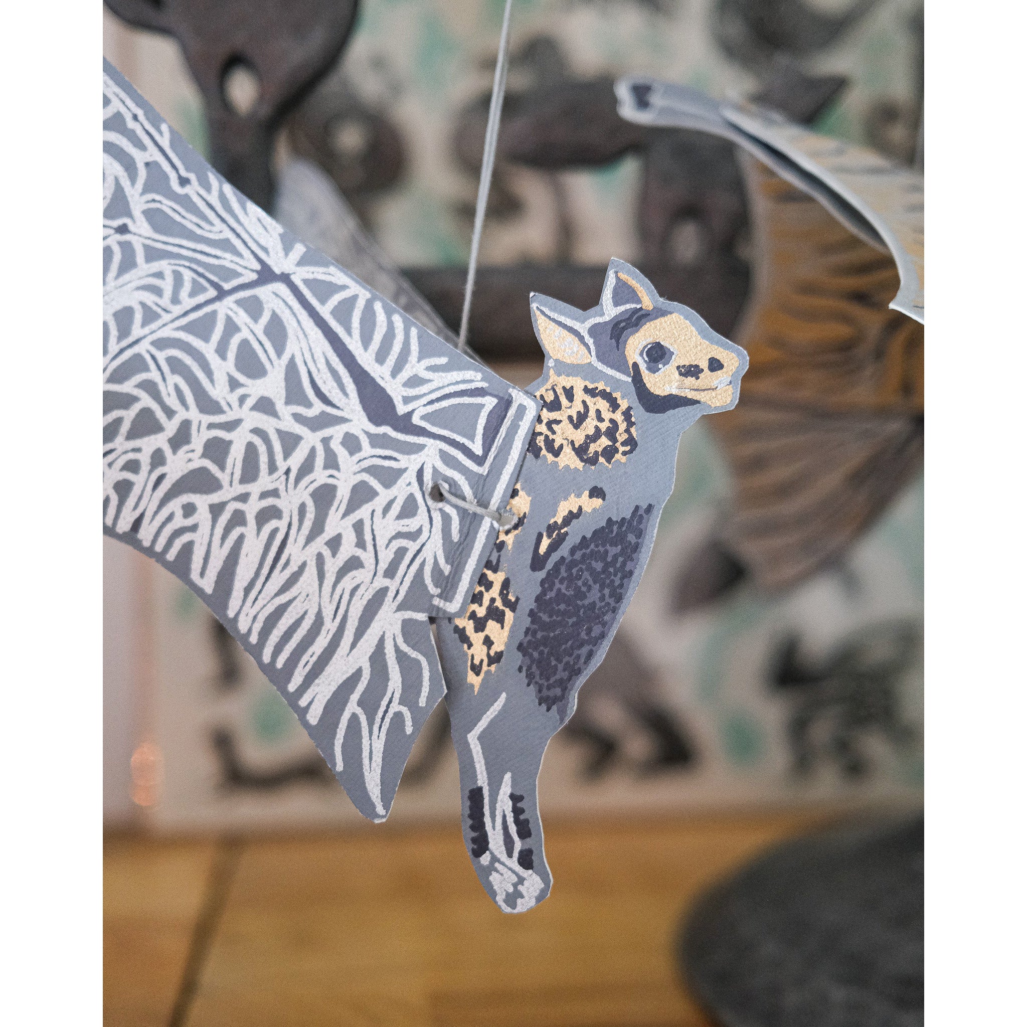 Three individual paper bats with fold-out wings and a cotton loop, ready to hang up and decorate your home for Halloween!