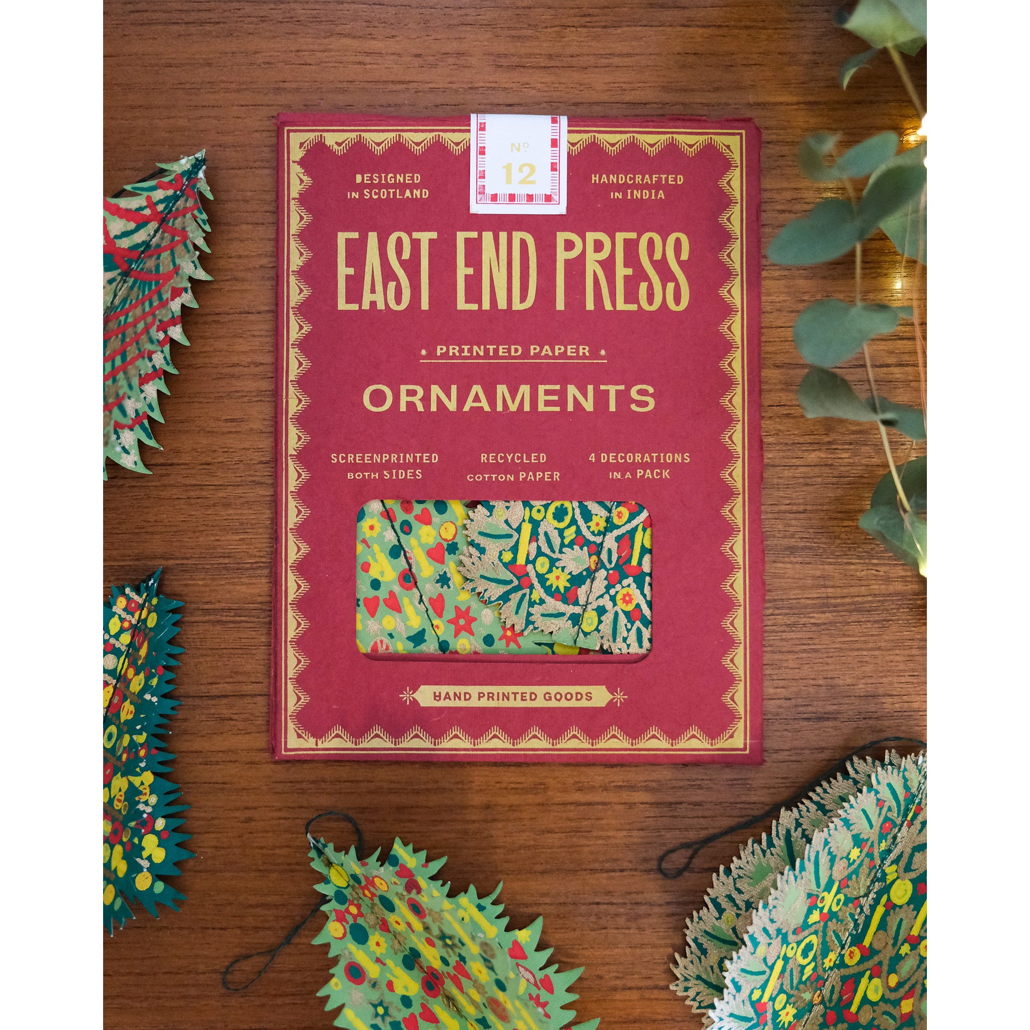 Each ornament features a different design, and each ornament is designed to fold out and create a three-dimensional paper shape with a cotton hanging loop.