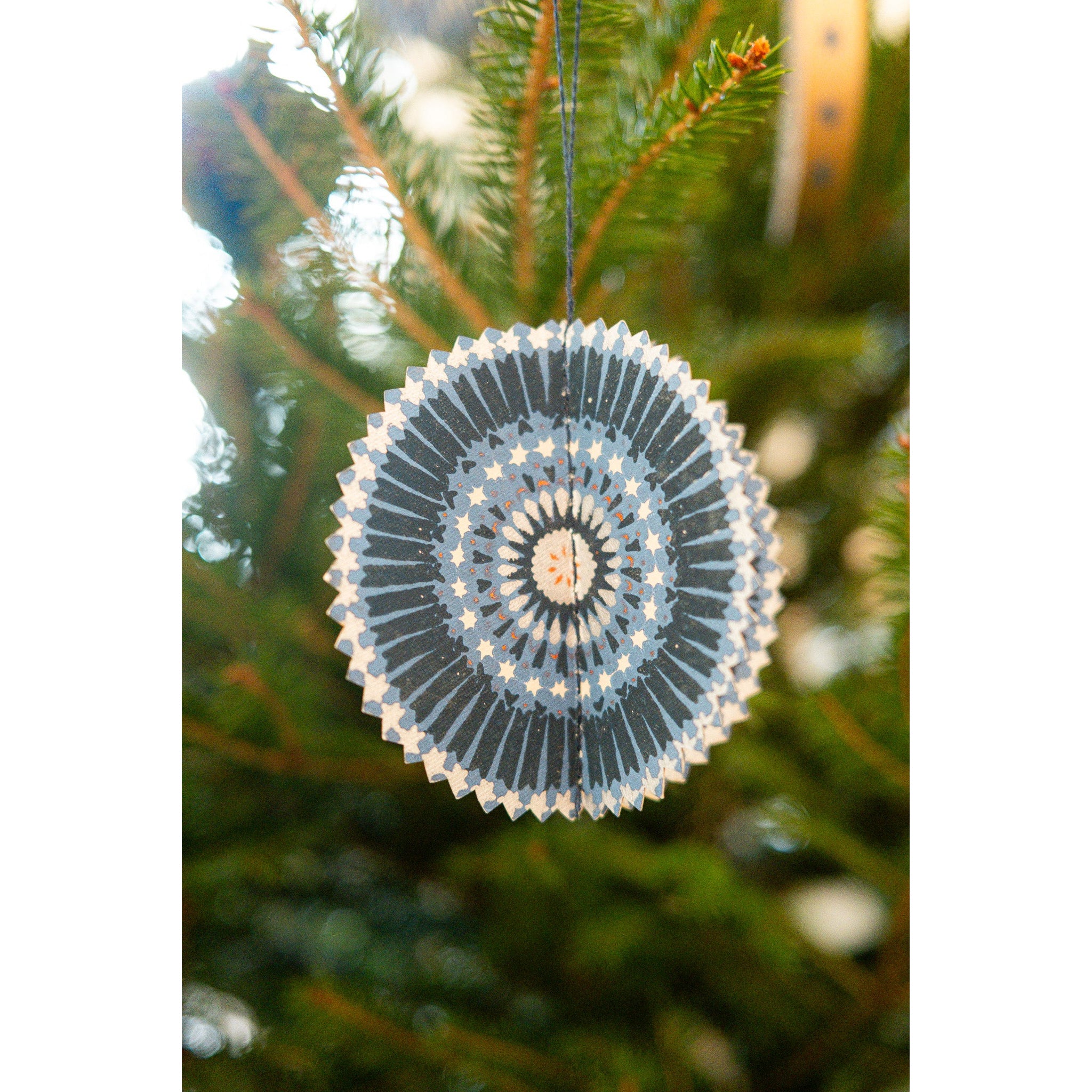 Each ornament features a different design, and each ornament is designed to fold out and create a three-dimensional paper shape with a cotton hanging loop.