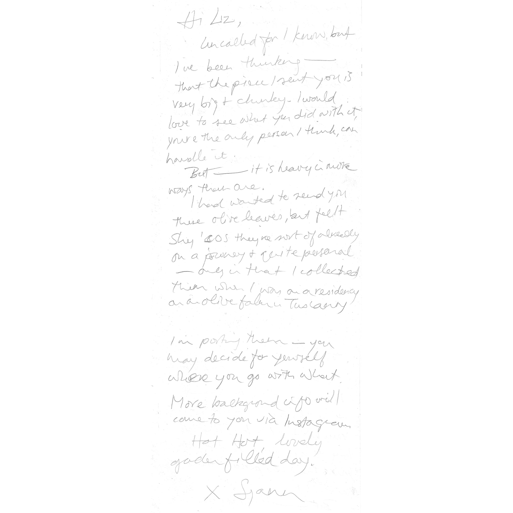 ”Syann sent me a little metal frame that she had had for ages but couldn't use or throw away, & also sent me some silver-plated olive leaves (incase the frame was too heavy & awkward to work with) which had a personal connection to her from an art residency in Italy.”