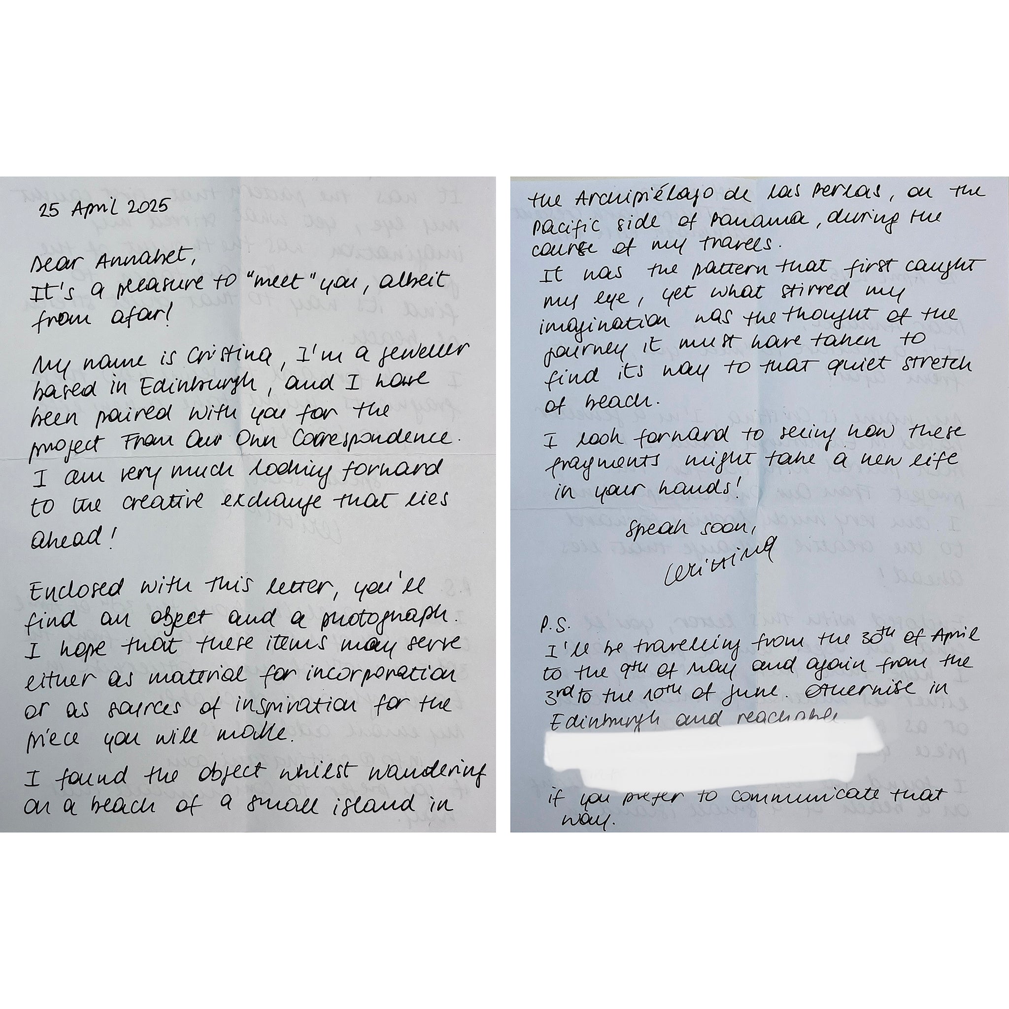 Made with a found piece of ceramic plate and drift wood gifted to Annabet by Cristina Zani as part of the 'From Our Own Correspondence' commission.