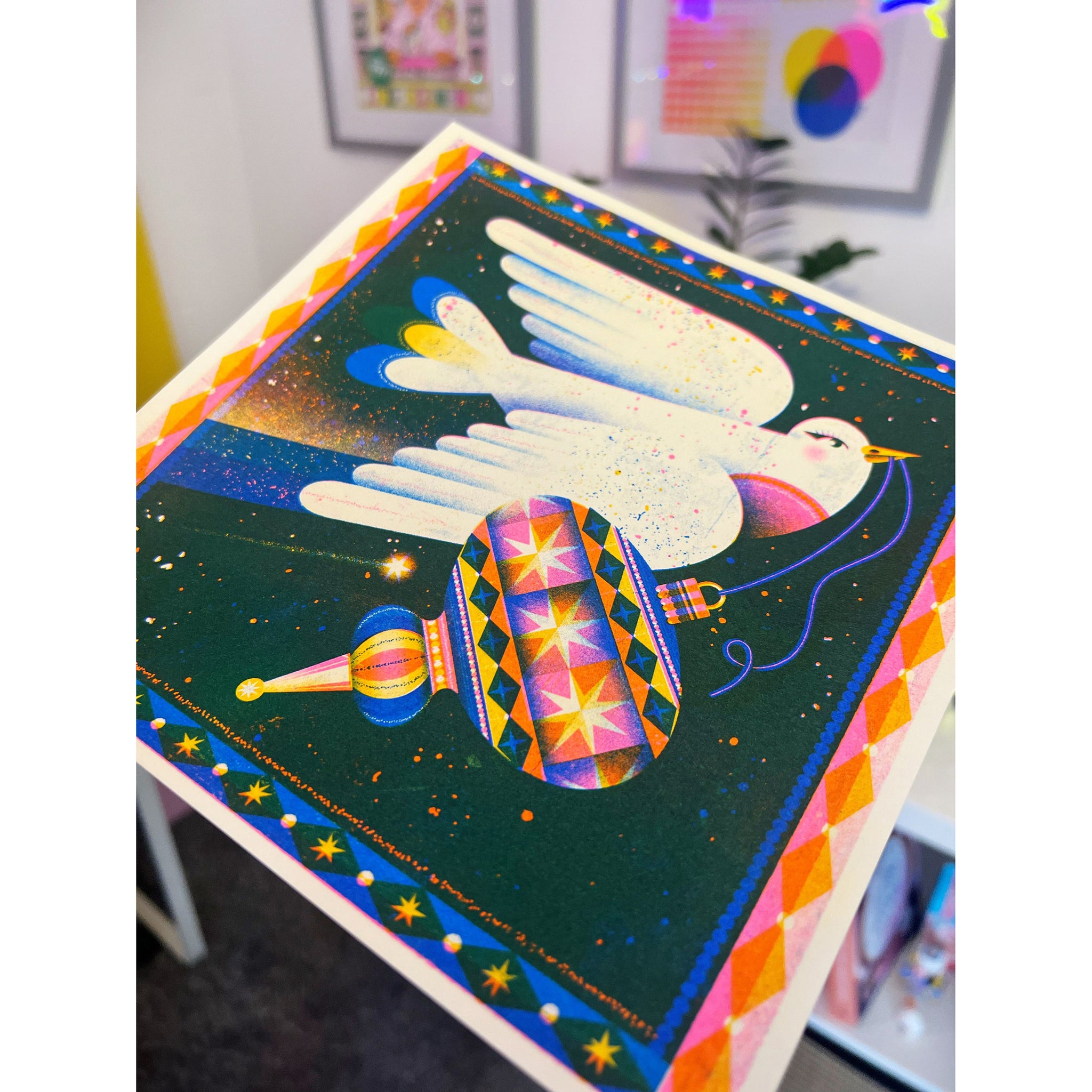 Christmas Dove is a 3 colour risograph in sunflower yellow, fluro pink and aqua ink printed on recycled coffee cup 140gsm paper.