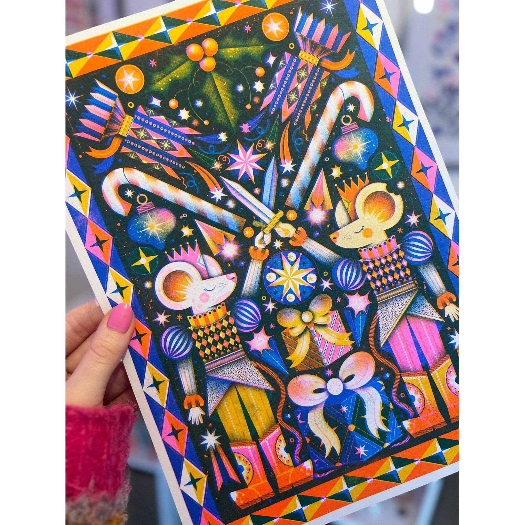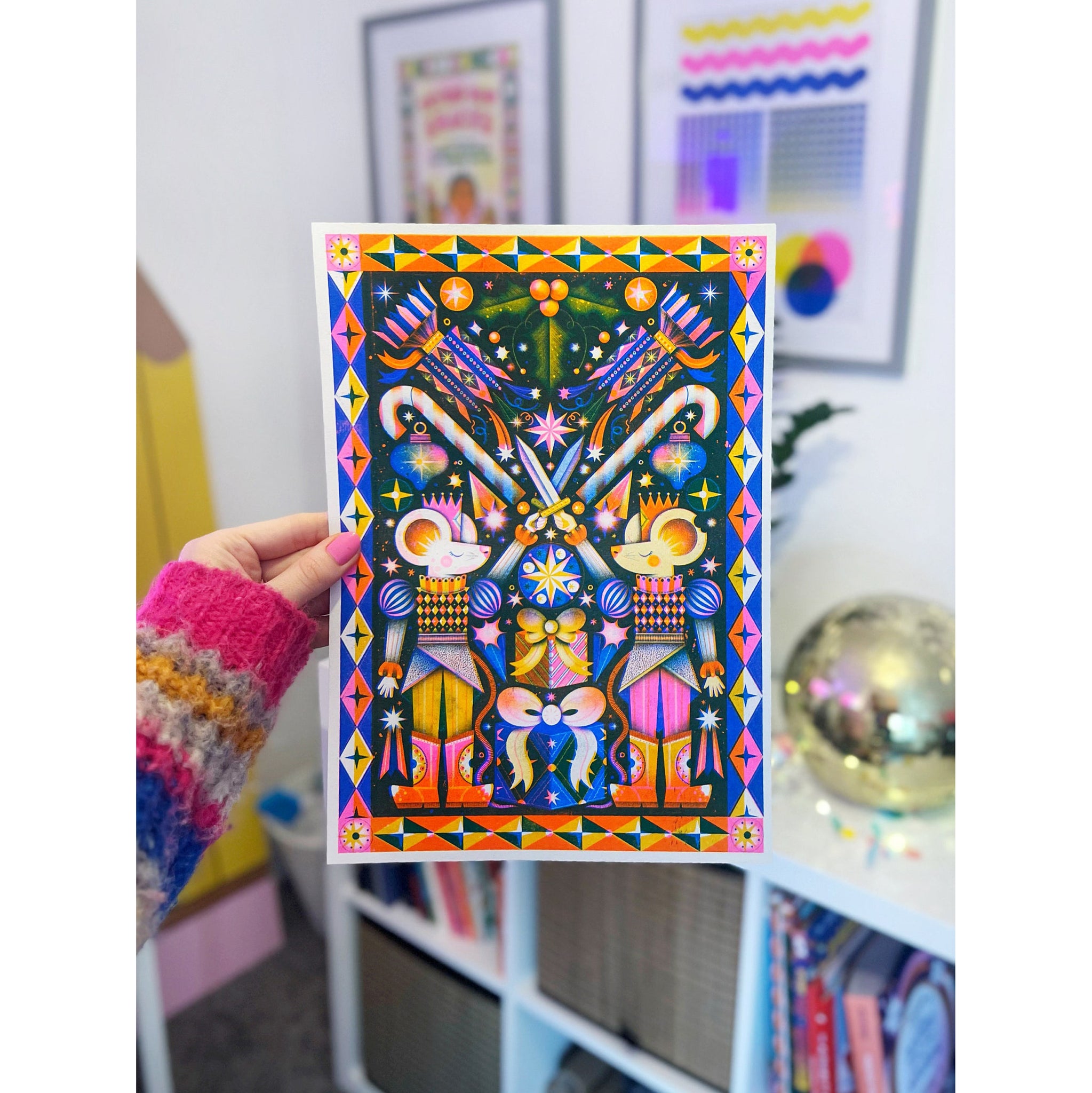 It's Christmas is a 3 colour risograph in sunflower yellow, fluro pink and aqua ink printed on recycled coffee cup 140gsm paper.
