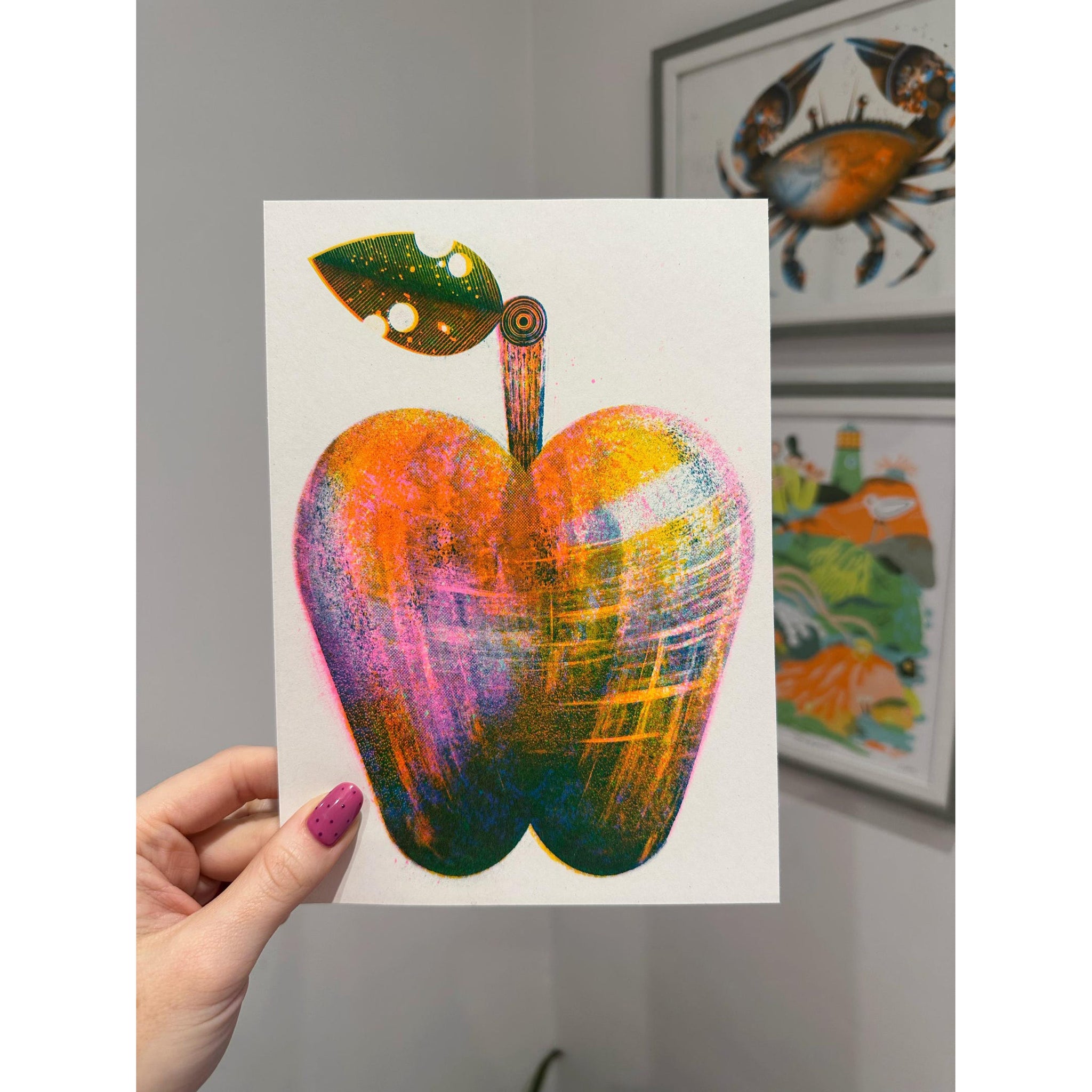 Ripe Apfel is a 3 colour risograph in fluro pink, teal and sunflower yellow ink printed on recycled coffee cup 190gsm paper.
