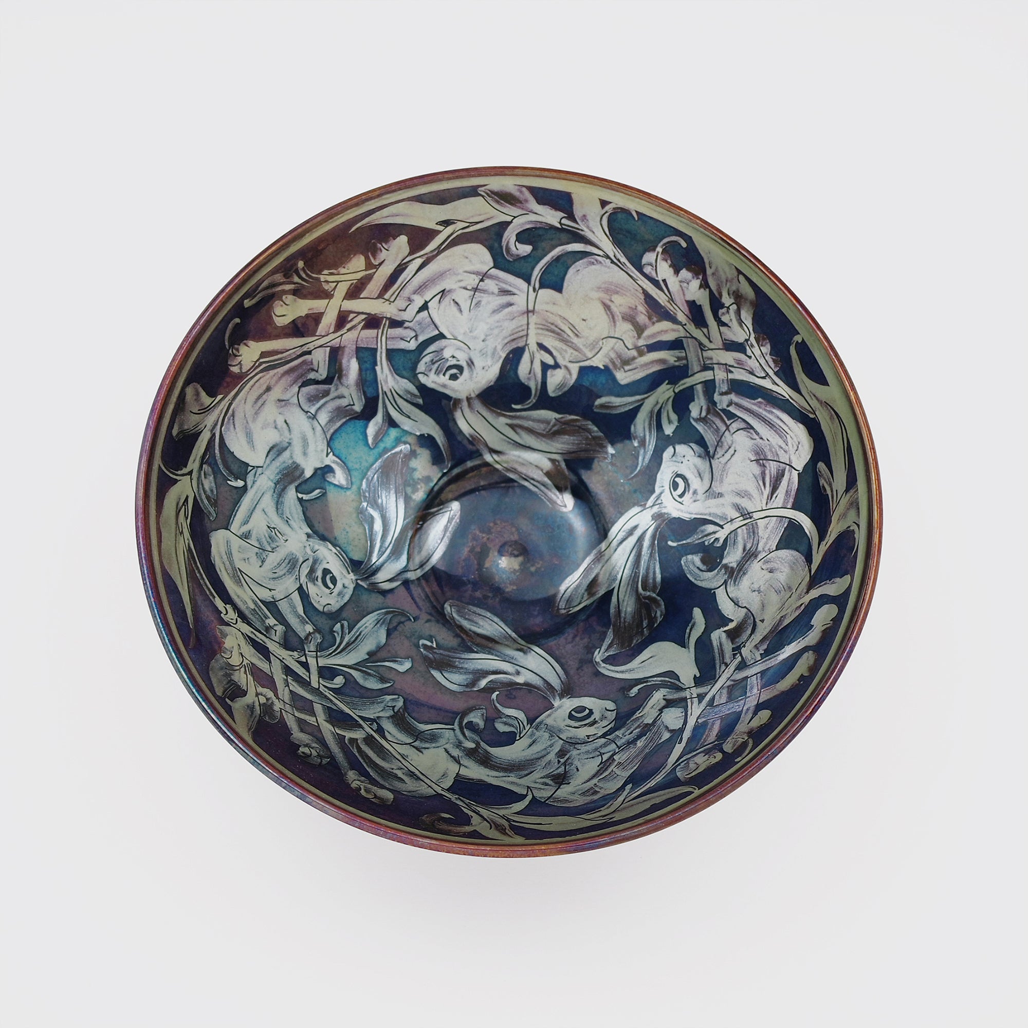 JCJ Pottery is Jonathan Chiswell Jones and Kerry Bosworth, making and decorating fine pots by hand. Their aim is to produce work which is practical, beautiful, and unmistakably theirs. Lustreware tiles are unsigned whether designed or decorated by Jonathan or Kerry. Lustreware decorated by Jonathan, is signed JCJ and each piece has a number. Number 1 was made in the first lustre firing at Peelings in 2001 and the series has reached over 8,000 by 2021. Records of each pot are kept in the pottery and help to identify some of the variables which went into its making. Where Kerry has designed and decorated a lustre pot, it will be signed KB and numbered in a separate series.