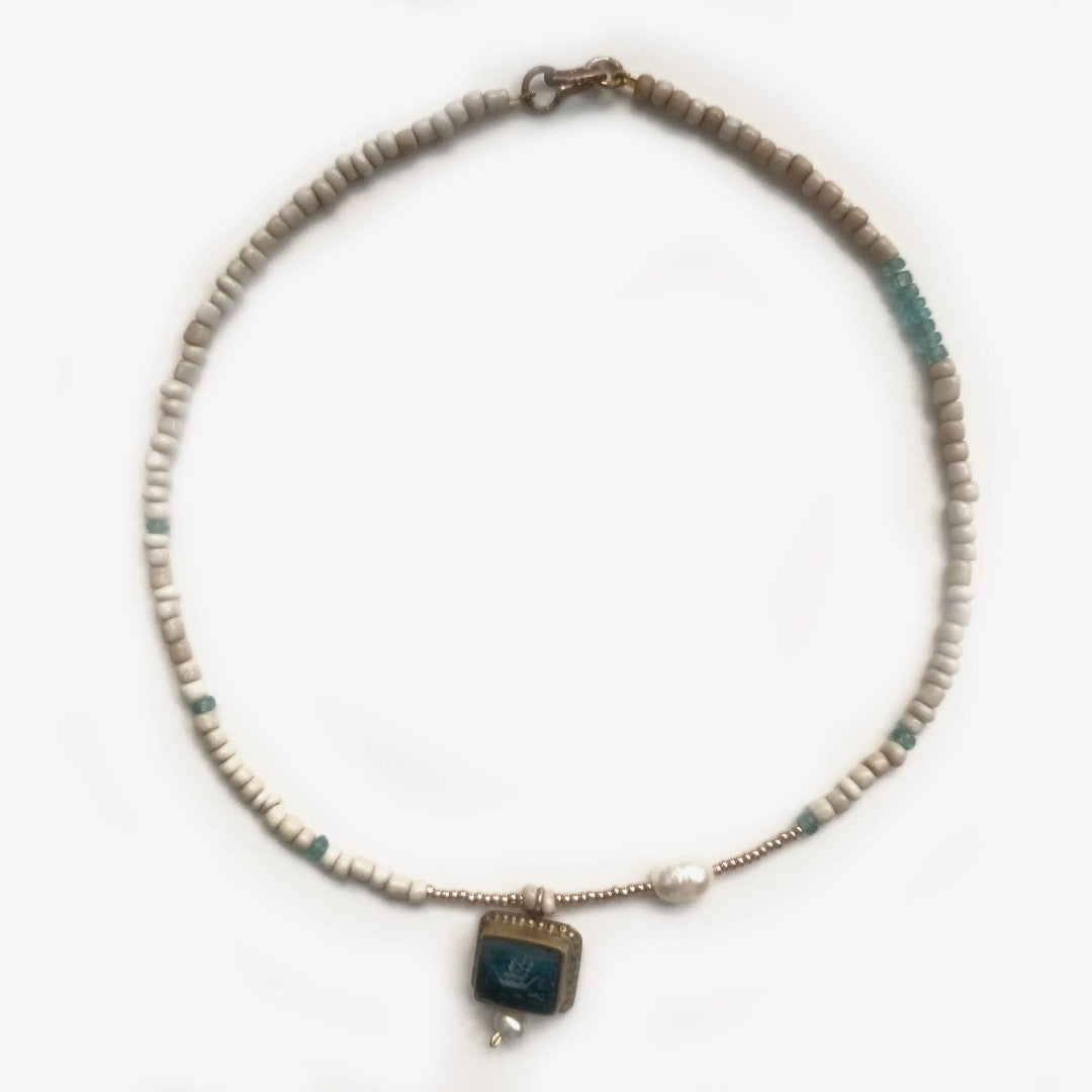 Ship pendant in brass with a hand painted insert set in resin on a ceramic beaded chain.