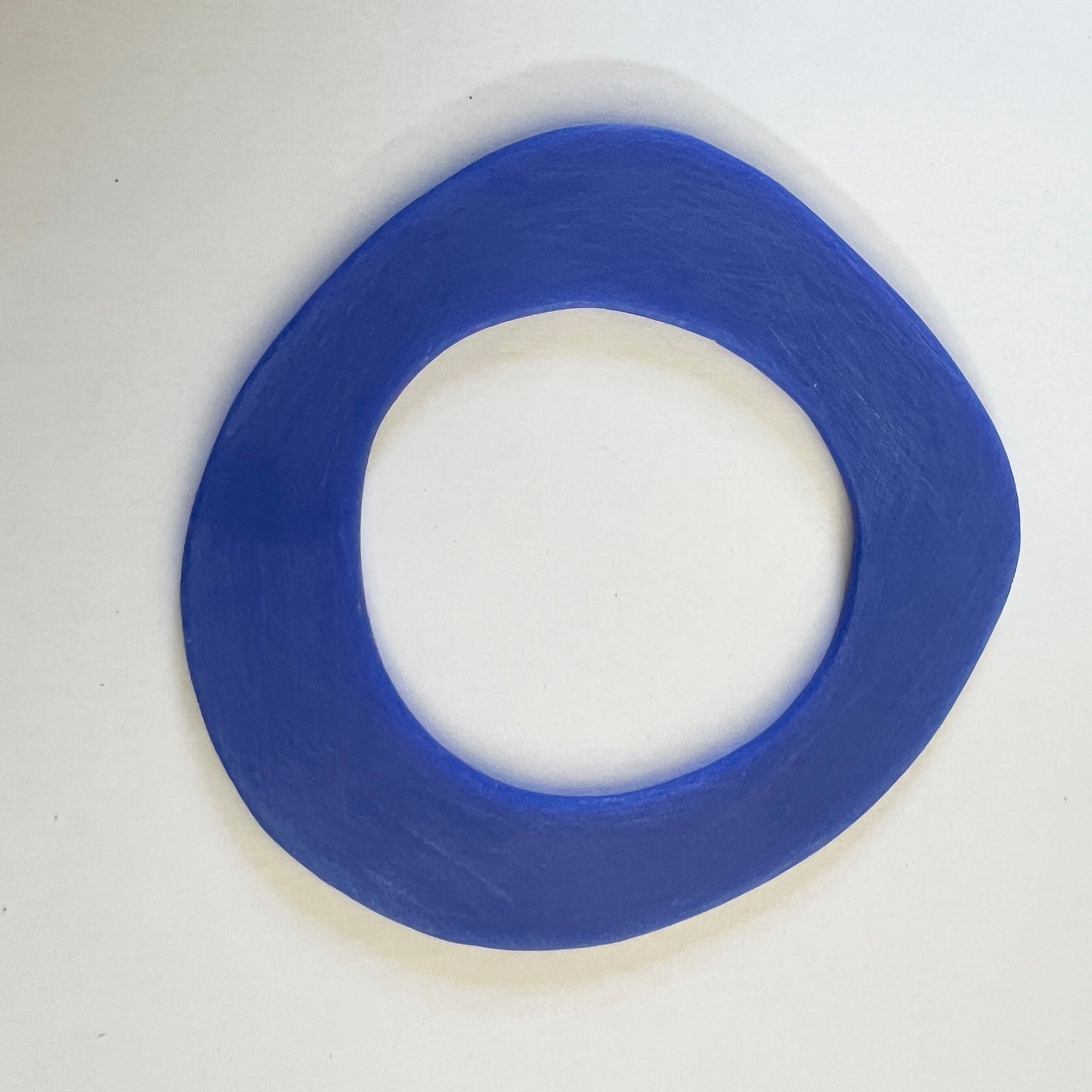 Cut with hand tools from waste acrylic this statement bangle a soft feel and an asymmetric shape as well as an amazing colour. The surface has resin details and is scratched and marked giving it an individual character.
