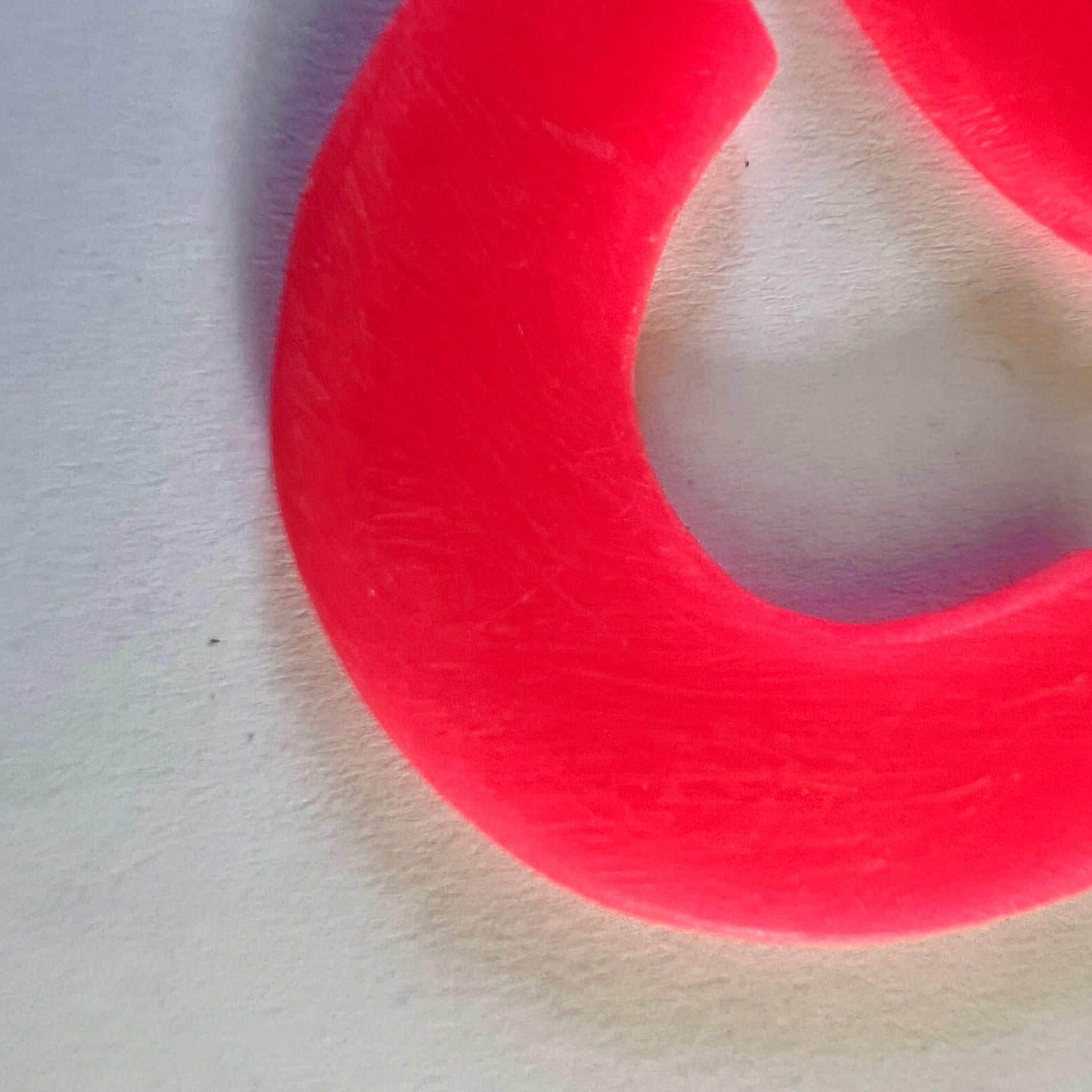 Bold arc shape reminiscent of a boat or a bay. These bright pink earrings make a positive statement. Hand cut from beach plastic and combined with recycled silver wires they have a matt, scratched texture.
