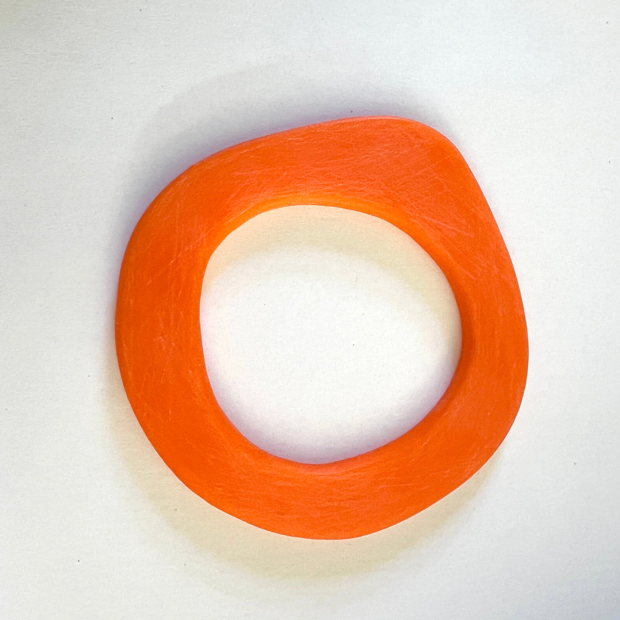 Cut with hand tools from waste acrylic this statement bangle has a soft feel and an asymmetric shape as well as an amazing colour. The surface is scratched and marked giving it an individual character.