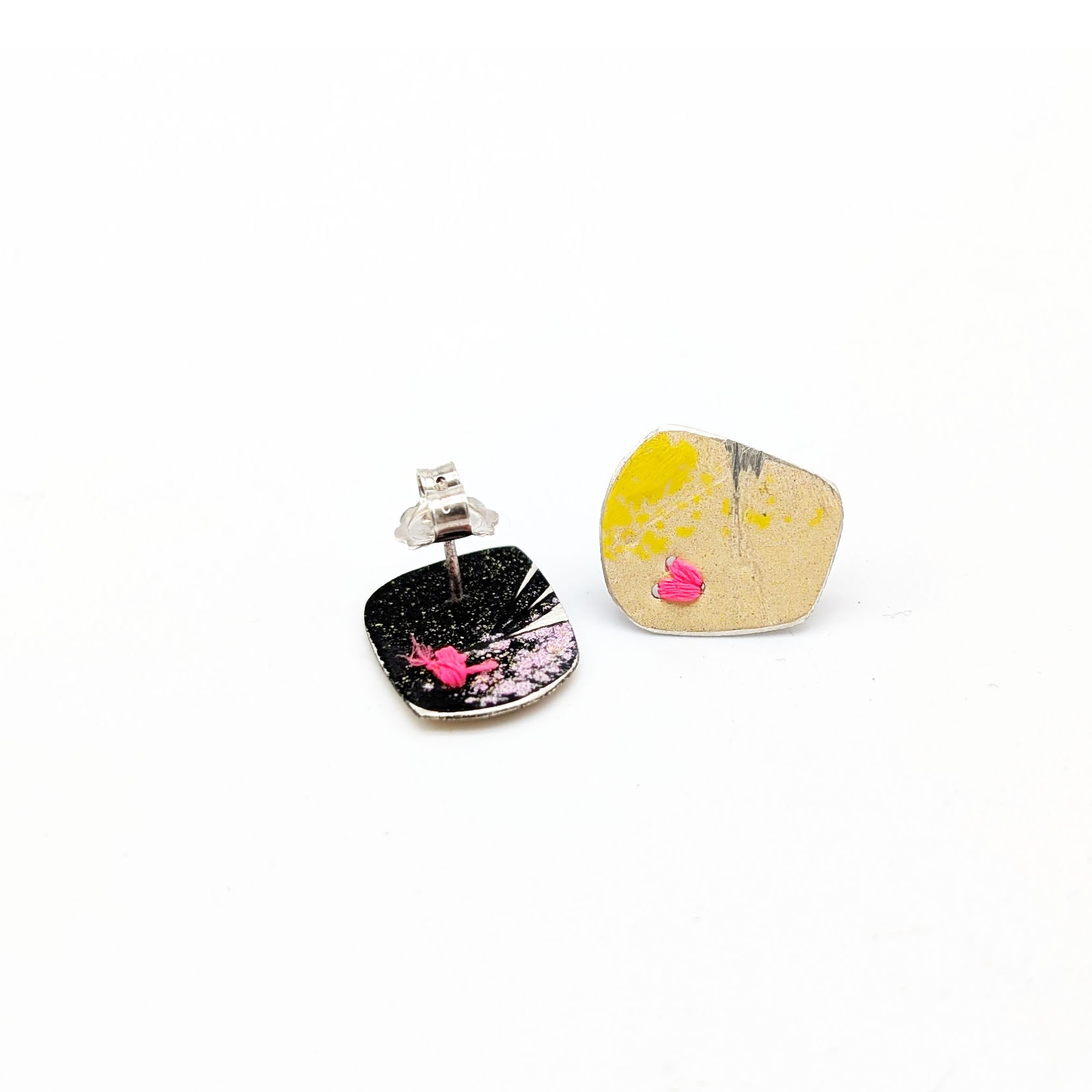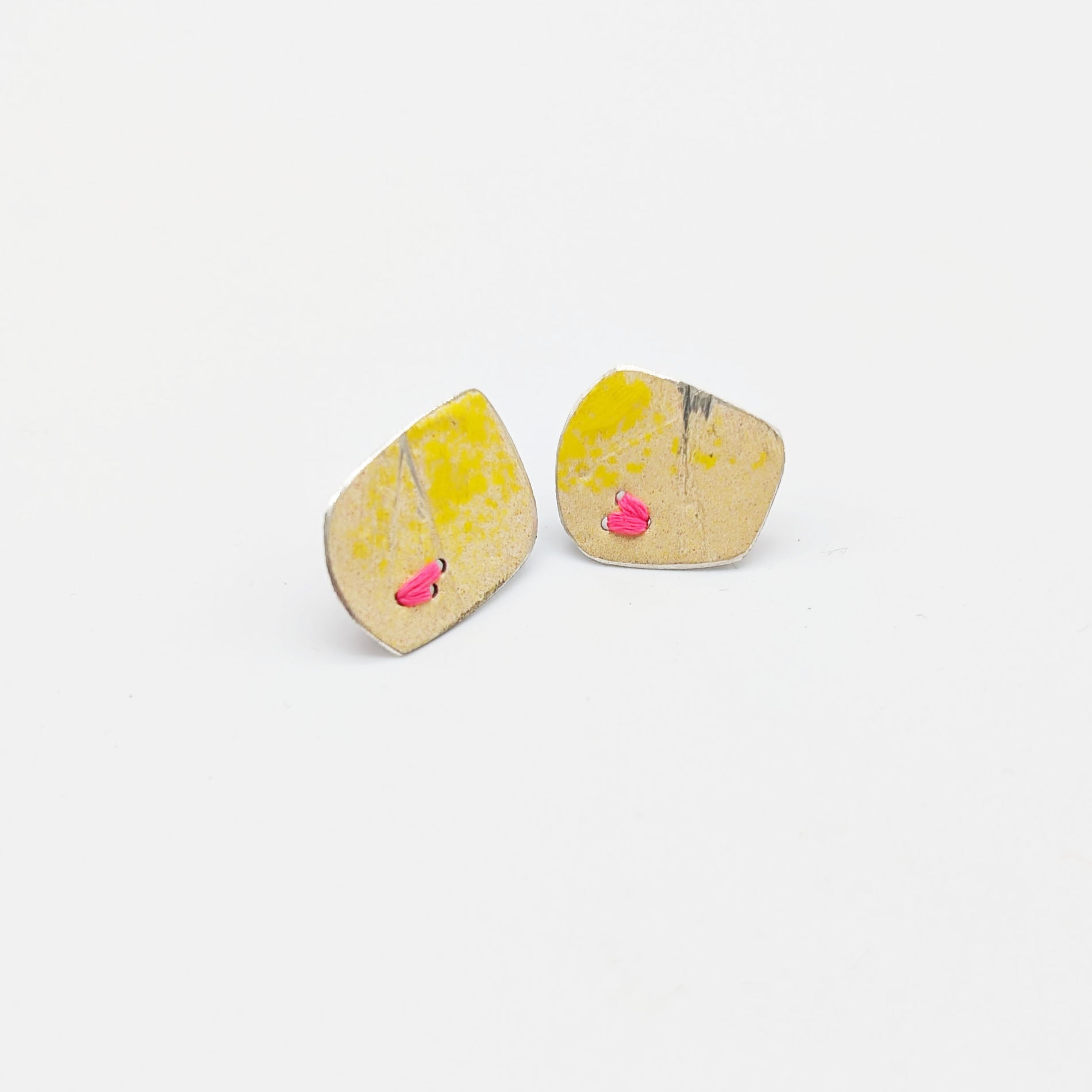 Faye Hall works across textiles and wearable objects, developing her textiles practice to also include the creation of colourful, playful and tactile wearable objects. Influenced by her drawing practice, Faye generates unique pieces of jewellery, in her West Yorkshire studio, that explore form, colour and materiality. As well as investigating this intrinsic dialogue between colour and shape, her work is anchored to exploring the relationships between contrasts; soft textile against the coldness of precious metal, the texture of a heavily embellished surface against smooth wood, among others.
