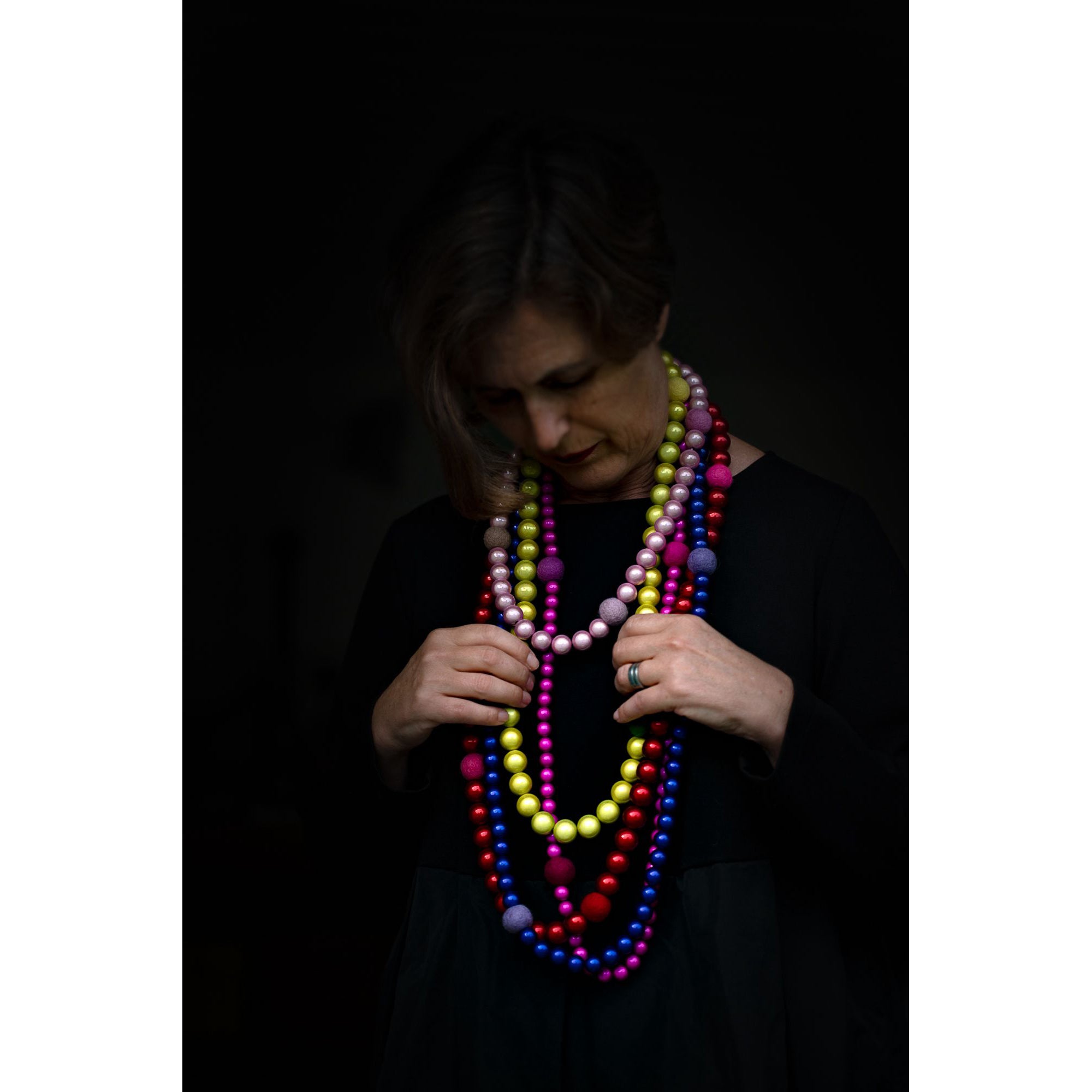 This bright beaded statement necklace is part of Lucy Anderson’s (very) limited collection, THREE FURRY BALLS.