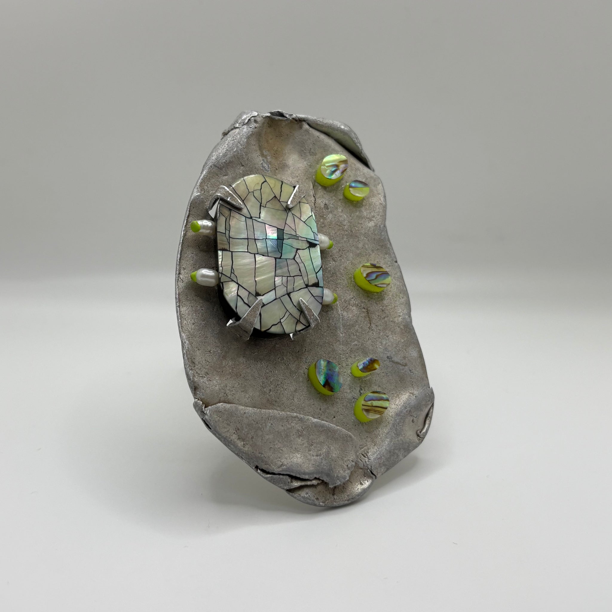 Materials: Found aluminium on a beach in the West coast of Ireland, Mother of pearl bead, fresh water pearls, acrylic, laser cut mother of pearl, steel pin and chemical adhesive.